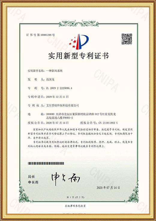 • 實用新型專利證書(一種空氣凈化通風循環(huán)裝置